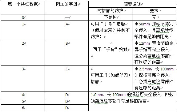 備注:接觸防護的級別比通過第1個特征數(shù)據(jù)所標注的要高,或者只應(yīng)該標注接觸防護的級別(第一個特征數(shù)據(jù)通過X來代替)。通過對接觸防護,只標注一個防護級別,可以將有關(guān)的更低的防護級別包括進去。